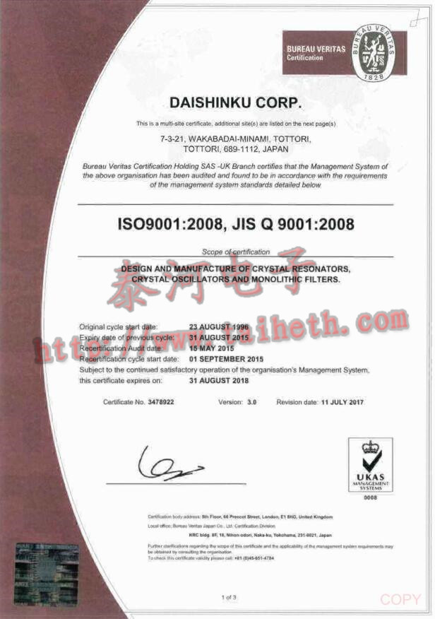 - [2023-06-21]臺灣加高晶振公司通過ISO 9001:...