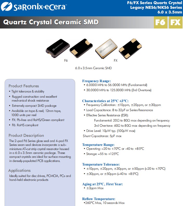 Diodes百利通亞陶晶振,F6兩腳貼片晶振,F61200046諧振器,小型貼片石英晶振主要采用了,先進的晶片的拋光工藝技術,是晶體行業中石英晶片研磨技術中表面處理的最高技術,最終使晶片表面更光潔,平行度及平面度更好,大大的降低諧振電阻,使精度得到了很大的提升。改變了傳統的生產工藝,使產品在各項參數得到了很大的改良,外觀尺寸具有薄型表面貼片型石英晶體諧振器,特別適用于有小型化要求的市場領域,比如智能手機,無線藍牙,平板電腦等電子數碼產品。