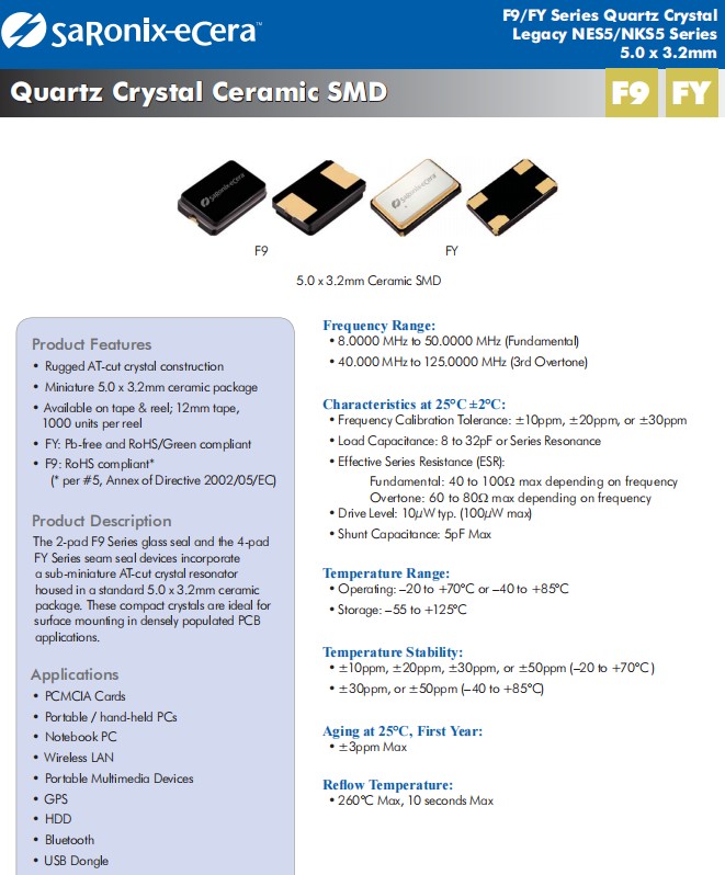 臺灣百利通晶振,F9系列5032mm石英晶體,F90800018Q藍牙晶振,F91200084晶振,筆記本電腦晶振,兩腳貼片F9系列玻璃密封和四腳貼片晶振FY系列接縫密封裝置包含一個亞最小AT切割晶體諧振器,采用標準5.0x3.2mm毫米陶瓷封裝。這些緊湊型晶體非常適合在密集PCB應用中進行表面安裝,堅固的AT切割水晶結構 微型5.0x3.2mm毫米陶瓷封裝 提供磁帶和卷軸;12毫米膠帶,每卷1000個,FY系列:無鉛且符合RoHS/綠色標準,F9系列:符合RoHS標準,應用程序:PCMCIA卡 便攜式/手持電腦 筆記本電腦 無線局域網 便攜式多媒體設備 全球定位系統 硬盤驅動器 藍牙 USB加密狗。